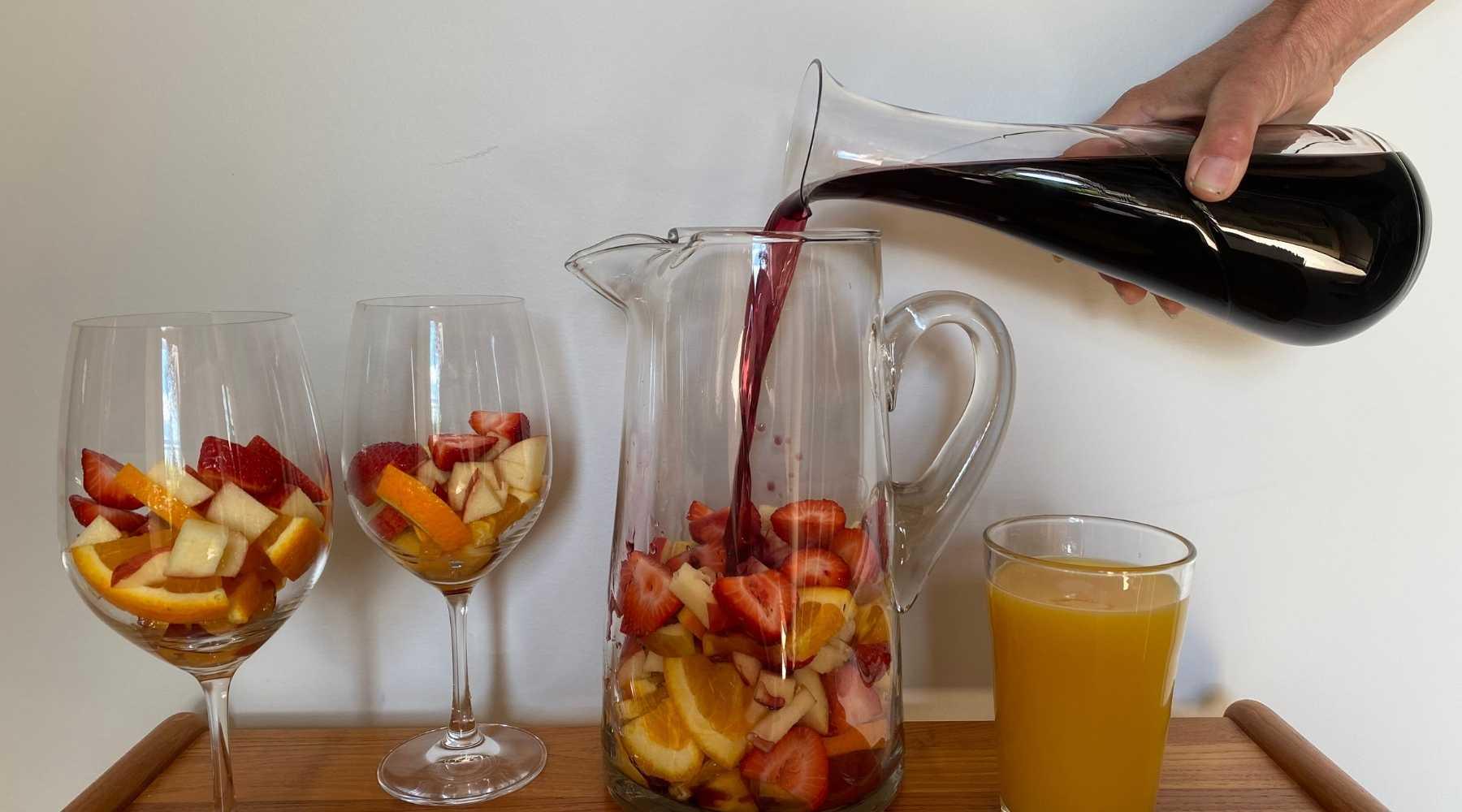 The fruit takes colour from the red wine in the fridge, so save some fresh sliced fruits to add to the glass later. This will make your drinks look extra fresh.