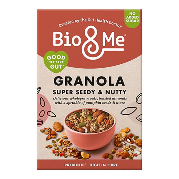 Bio&Me Gut-Loving Granola, 360g - Pack of 5 | Super Seedy & Nutty. Enjoy the wholesome blend of seeds and nuts in this gut-friendly granola. This pack of 5 delivers a deliciously crunchy breakfast, packed with probiotics and fibre to support digestive health and provide a satisfying, nutty crunch.