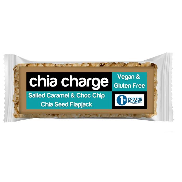 Chia Charge Vegan Chia Flapjack, 30g Salted Caramel & Choc Chip, blends rich salted caramel flavour with indulgent chocolate chips. Packed with oats and chia seeds, it provides sustained energy, Omega-3s, and fibre. Vegan, dairy-free, and made with natural ingredients, it’s a delicious, wholesome snack for any time of day.