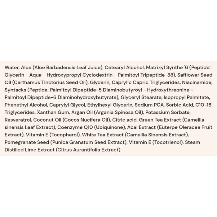 Water, Aloe (Aloe Barbadensis Leaf Juice), Cetearyl Alcohol, Matrixyl Synthe '6 (Peptide: Glycerin - Aqua - Hydroxypropyl Cyclodextrin - Palmitoyl Tripeptide-38), Safflower Seed Oil (Carthamus Tinctorius Seed Oil), Glycerin, Caprylic Capric Triglycerides, Niacinamide, Syntacks (Peptide: Palmitoyl Dipeptide-5 Diaminobutyroyl - Hydroxythreonine - Palmitoyl Dipeptide-6 Diaminohydroxybutyrate), Glyceryl Stearate, Isopropyl Palmitate, Phenethyl Alcohol, Caprylyl Glycol, Ethylhexyl Glycerin, Sodium PCA, Sorbic Acid, C10-18 Triglycerides, Xanthan Gum, Argan Oil (Argania Spinosa Oil), Potassium Sorbate, Resveratrol, Coconut Oil (Cocos Nucifera Oil), Citric acid, Green Tea Extract (Camellia sinensis Leaf Extract), Coenzyme Q10 (Ubiquinone), Acai Extract (Euterpe Oleracea Fruit Extract), Vitamin E (Tocopherol), White Tea Extract (Camellia Sinensis Extract), Pomegranate Seed (Punica Granatum Seed Extract), Vitamin E (Tocotrienol), Steam Distilled Lime Extract (Citrus Aurantifolia Extract).