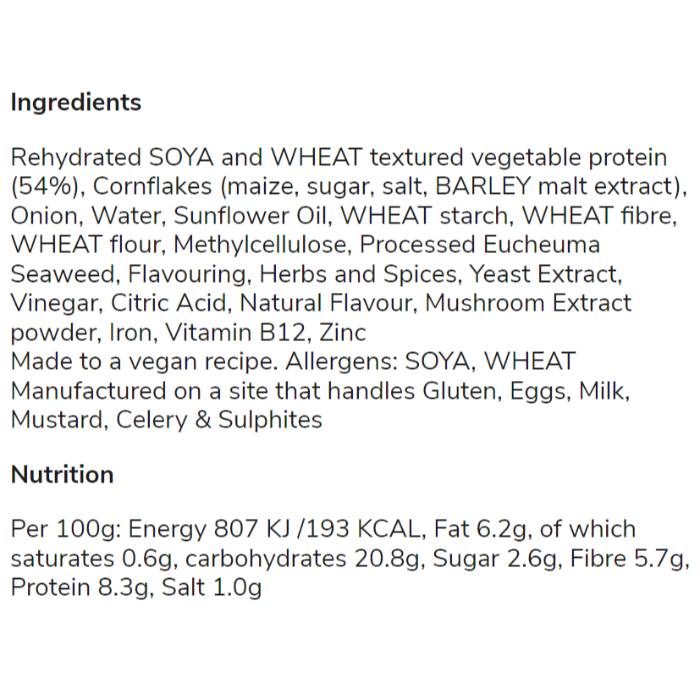Rehydrated SOYA and WHEAT textured vegetable protein (54%), Cornflakes (maize, sugar, salt, BARLEY malt extract), Onion, Water, Sunflower Oil, WHEAT starch, WHEAT fibre, WHEAT flour, Methylcellulose, Processed Eucheuma Seaweed, Flavouring, Herbs and Spices, Yeast Extract, Vinegar, Citric Acid, Natural Flavour, Mushroom Extract powder, Iron, Vitamin B12, Zinc