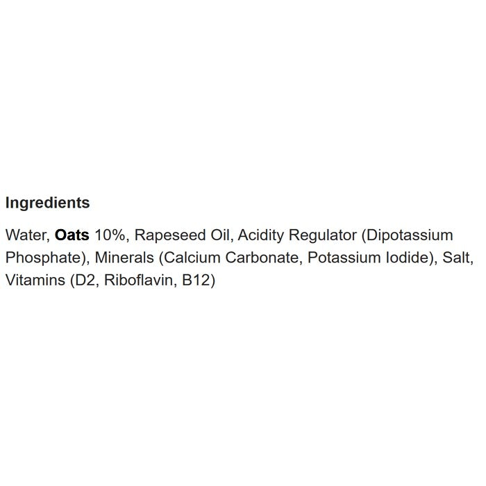 Oat Base (Water, Oats 10%), Rapeseed Oil, Calcium Carbonate, Calcium Phosphates, Iodised Salt, Vitamins (D2, Riboflavin, B12)