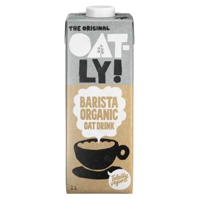Oatly Organic Barista is a creamy, organic oat milk perfect for coffee, vegan, free from added sugars, soy, and nuts, ideal for frothing.
