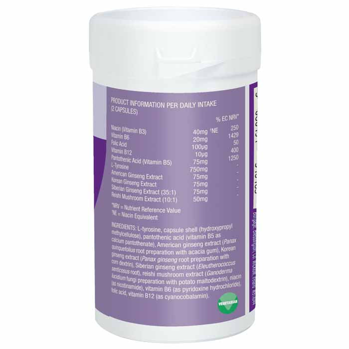 L Tyrosine, American Ginseng Extract, Korean Ginseng Extract, Pantothenic Acid, Siberian Ginseng Extract, Reishi Mushroom Extract, Niacin, Vitamin B6, Folic Acid, Vitamin B12.