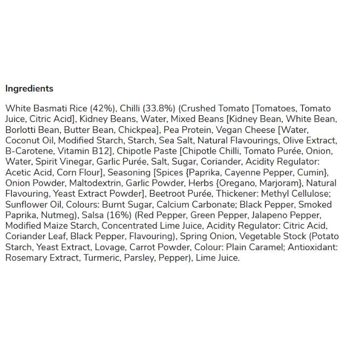 White Basmati Rice, Chilli (Tomato Sauce [Tomatoes, Water, Salt], Water, Mixed Beans [Kidney Bean, White Bean, Borlotti Bean, Butter Bean, Chickpea], Tomato, Pea Protein, Vegan Cheeze [Water, Coconut Oil, Modified Starch, Starch, Sea Salt, Flavourings, Olive Extract, B-Carotene, Vitamin B12], Chipotle Paste [Chipotle Chilli, Tomato Purée, Onion, Water, Spirit Vinegar, Garlic Purée, Salt, Sugar, Coriander, Acidity Regulator: Acetic Acid, Corn Flour], Onion, Seasoning [Spices {Paprika, Cayenne Pepper, Cumin}, Salt, Onion Powder, Cornflour, Maltodextrin, Garlic Powder, Herbs {Oregano, Marjoram}, Natural Flavouring, Yeast Extract Powder], Garlic Powder, Beetroot Purée, Thickener: Methyl Cellulose, Sunflower Oil, Natural Flavourings, Colour: Burnt Sugar, Calcium Carbonate, Black Pepper, Smoked Paprika, Nutmeg, Iron, Vitamin B12), Salsa (Tomato, Onion, Tomato Purée, Red Pepper, Green Pepper, Jalapeno Pepper, Modified Maize Starch, Concentrated Lime Juice, Acidity Regulator: Citric Acid, Coriander Leaf, Black Pepper, Flavouring), Kidney Beans, Red Pepper, Spring Onion, Vegan Cheeze (Water, Coconut Oil, Modified Starch, Starch, Sea Salt, Flavourings, Olive Extract, B-Carotene, Vitamin B12), Jalapenos (Jalapenos, Water, Salt, Vinegar, Calcium Chloride), Vegetable Stock (Sunflower Oil, Salt, Potato Starch, Maltodextrin, Sugar, Yeast Extract, Lovage, Carrot Powder, Onion Powder, Garlic Powder, Colour: Plain Caramel, Antioxidant: Rosemary Extract, Turmeric, Parsley, Flavouring, Pepper), Lime Juice