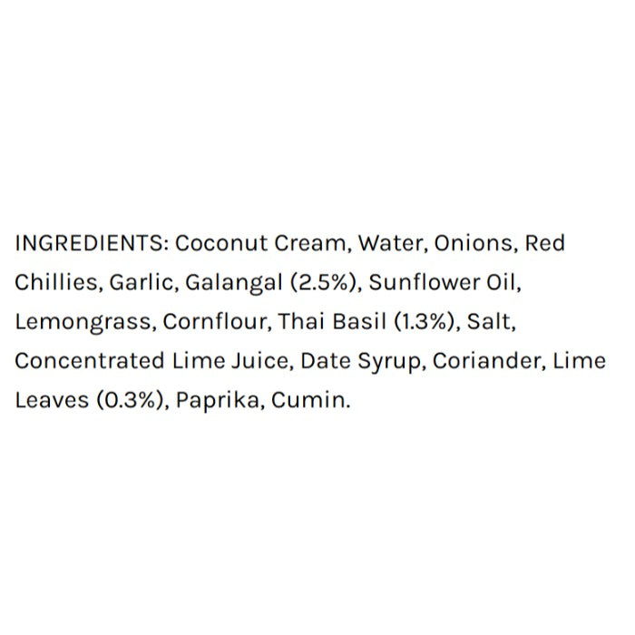 Coconut Cream, Water, Onions, Red Chillies, Garlic, Galangal (2.5%), Sunflower Oil, Lemongrass, Cornflour, Thai Basil (1.3%), Salt, Concentrated Lime Juice, Date Syrup, Coriander, Lime Leaves (0.3%), Paprika, Cumin.