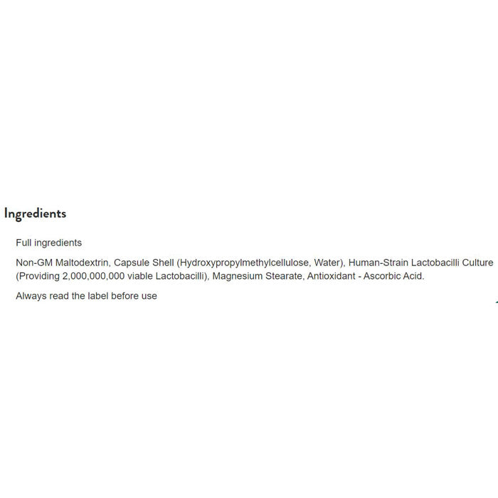 Non-GM Maltodextrin, Capsule Shell (Hydroxypropylmethylcellulose, Water), Human-Strain Lactobacilli Culture (Providing 2,000,000,000 viable Lactobacilli), Magnesium Stearate, Antioxidant - Ascorbic Acid.