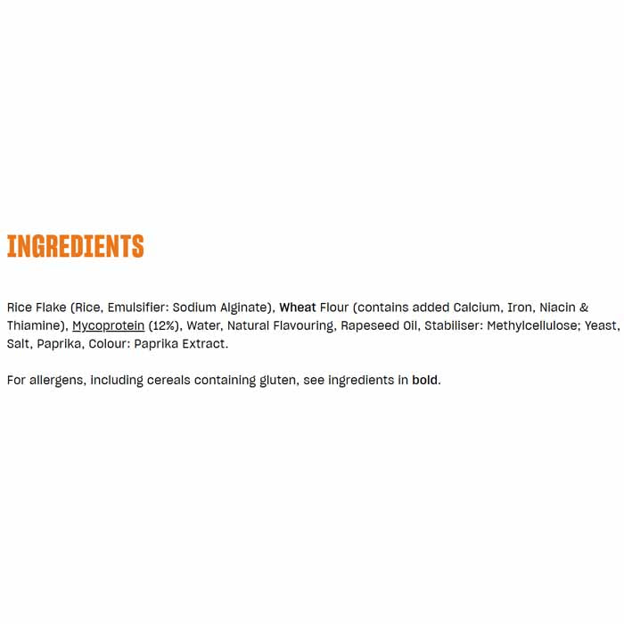 Rice Flake (Rice, Emulsifier: Sodium Alginate), Wheat Flour (contains added Calcium, Iron, Niacin & Thiamine), Mycoprotein (12%), Water, Natural Flavouring, Rapeseed Oil, Stabiliser: Methylcellulose; Yeast, Salt, Paprika, Colour: Paprika Extract.