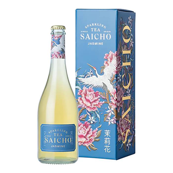 Saicho Jasmine Sparkling Tea is available in multiple sizes, including a 200ml bottle and a 750ml gift box. -