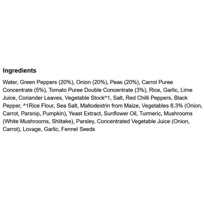 Water, Green Peppers (20%), Onion (20%), Peas (20%), Carrot Puree Concentrate (5%), Tomato Puree Double Concentrate (3%), Rice, Garlic, Lime Juice, Coriander Leaves, Vegetable Stock^1, Salt, Red Chilli Peppers, Black Pepper, ^1rice Flour, Sea Salt, Maltodextrin From Maize, Vegetables 8.3% (Onion, Carrot, Parsnip, Pumpkin), Yeast Extract, Sunflower Oil, Turmeric, Mushrooms (White Mushrooms, Shiitake), Parsley, Concentrated Vegetable Juice (Onion, Carrot), Lovage, Garlic, Fennel Seeds
