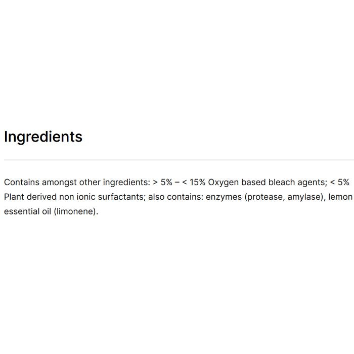 Contains amongst other ingredients: > 5% - < 15% Oxygen based bleach agents; < 5% Non ionic surfactants; also contains: enzymes (protease, amylase), perfume, d-limonen