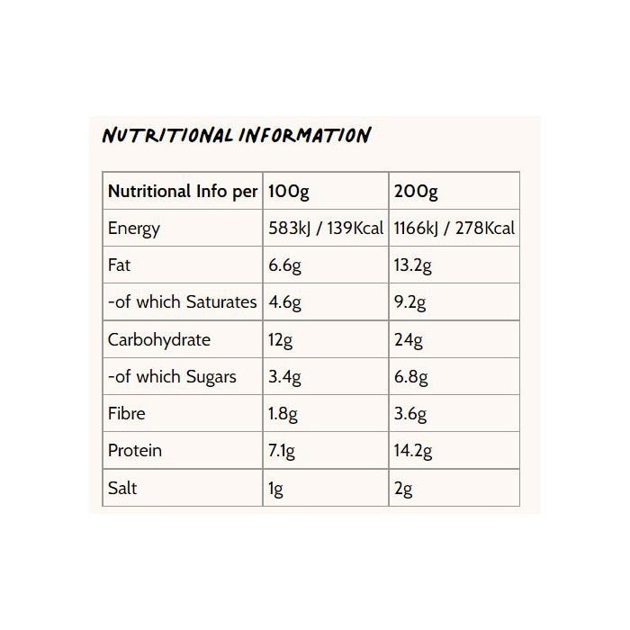 Water, Vegan Pieces 20% (Water, Wheat Gluten, Soya Protein, Rapeseed Oil, Non-Hydrogenated Vegetable Fat (Sustainable Palm), Coconut Oil, Potato Starch, Salt, Dried Yeast, Sugar, Natural Flavouring, Yeast Extract, Onion Powder, Thickeners: Carrageenan, Methyl Cellulose; Wheat Fibre, Preservative: Potassium Sorbate, Herbs, Spices, Colour: Iron Oxide, Garlic Powder, Barley Malt Extract), Vegan Cheese 18% (Water, Coconut Oil, Potato Starch, Rehydrated Peppers 3% (Water, Red & Green Peppers, Red & Green Jalapeno Peppers), Modified Maize Starch, Sea Salt, Chilli Seasoning (Paprika, Chilli, Cumin, Sugar, Salt, Black Pepper, Garlic Powder, Tomato Powder, Onion, Paprika Extract, Bell Peppers, Tomato Granules, Parsley, Acidity Regulator: Citric Acid), Dried Yeast, Thickener (Carrageenan), Natural Flavouring, Calcium Phosphate, Yeast Extract, Vitamin B12, Haricot Beans 18%, Tomato Puree, Modified Maize Starch, Salt, Cider Vinegar, Onion Powder, Paprika, White Pepper, Ground Nutmeg, Vitamin B12.