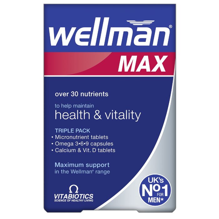 Wellman Max by Vitabiotics is an advanced, high-strength triple-pack supplement developed to provide men with maximum daily nutritional support. Each daily dose includes a Wellman multivitamin tablet with 27 nutrients, an omega 3·6·9 capsule with fish, flaxseed, and starflower oils, and a calcium-magnesium tablet to support bones, muscle function, and nerve transmission. Key nutrients such as B vitamins, zinc, selenium, and vitamin D work together to support energy levels, immune system function, testosterone maintenance, and cognitive health. Designed for men with active or demanding lifestyles, this all-in-one solution ensures comprehensive nutritional intake without needing to take multiple separate supplements. Wellman Max is manufactured to GMP standards and offers exceptional quality and convenience for men seeking to maintain vitality, mental focus, and long-term wellness.