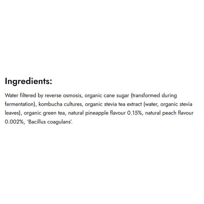 Water Filtered By Reverse Osmosis, Cane Sugar* (Transformed During Fermentation), Kombucha Cultures, Stevia Tea Extract* (Water, Organic Stevia Leaves), Green Tea*, Natural Pineapple Flavour 0.15%, Natural Peach Flavour 0.002%, 'Bacillus Coagulans'