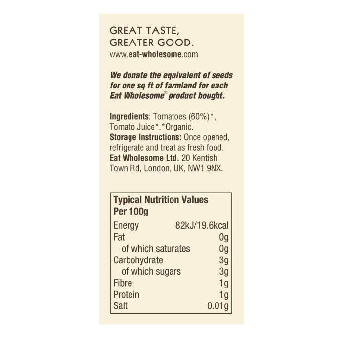 Inside every tin of Eat Wholesome Organic Peeled Plum Tomatoes, you’ll find 100% organic tomatoes and tomato juice. Nothing more, nothing less, just plant-powered goodness. That means no preservatives, no additives, and no tomato concentrate to bulk out your buy.
