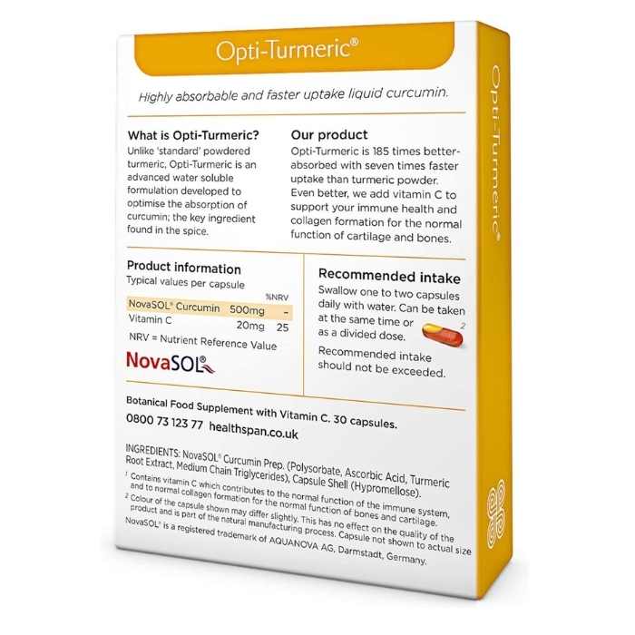 Healthspan Opti-Turmeric capsules contain advanced liquid curcumin, with added vitamin C. In comparison with regular powdered turmeric, Opti-Turmeric® is 185 times better absorbed, with 7 times faster uptake.