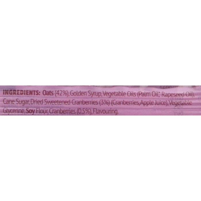 Oats (Gluten) (48%), Golden Syrup, Vegetable Margarine (Vegetable Oils, Water, Salt), Cane Sugar, Vegetable Glycerine, Soya Flour, Sweetened Dried Cranberries (3%) (Cranberries, Sugar, Sunflower Oil), Freeze Dried Cranberries (0.5%), Flavouring.