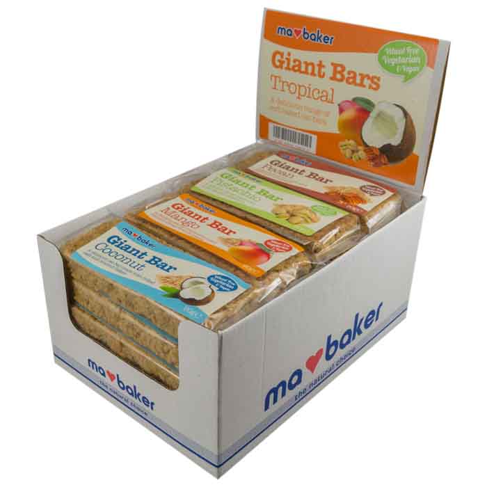 Coconut, Mango, Pecan, Pistachio. Ingredients: Ma Baker Giant (Tropical) Coconut - Oats (Gluten) (40%), Vegetable Margarine (Vegetable Oils, Water, Salt), Golden Syrup, Cane Sugar, Desiccated Coconut (4%), Vegetable Glycerine, Soya Flour, Flavouring. Ma Baker Giant (Tropical) Mango - Oats (Gluten) (39%), Vegetable Margarine (Vegetable Oils, Water, Salt), Golden Syrup, Cane Sugar, Dried Apple (3.5%), Vegetable Glycerine, Soya Flour, Mango (3%), (Mango, Sugar, Citric Acid, Sulphites), Flavouring. Ma Baker Giant (Tropical) Pistachio - Oats (Gluten) (39%), Vegetable Margarine (Vegetable Oils, Water, Salt), Golden Syrup, Cane Sugar, Pistachios (6%), Vegetable Glycerine, Soya Flour, Flavouring. Ma Baker Giant (Tropical) Pecan - Oats (Gluten) (39%), Vegetable Margarine (Vegetable Oils, Water, Salt), Golden Syrup, Cane Sugar, Vegetable Glycerine, Pecans (3%), Walnuts (3%), Soya Flour, Flavouring.