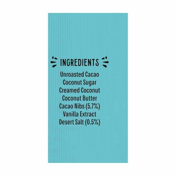 Unroasted Cacao*, Coconut Sugar*, Creamed Coconut*, Cocoa Butter*, Cacao Nibs* (5.7%), Vanilla Extract*, Desert Salt (0.5%). *Certified organic. Fairtrade certified according to the Fair for Life standard (53%).