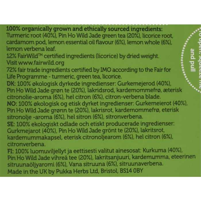 Organic Turmeric Gold: Turmeric Root (40%), Green Tea (20%), Liquorice Root, Cardamom Pod, Lemon Essential Oil Flavour (6%), Lemon Whole (6%), Lemon Verbena Leaf.