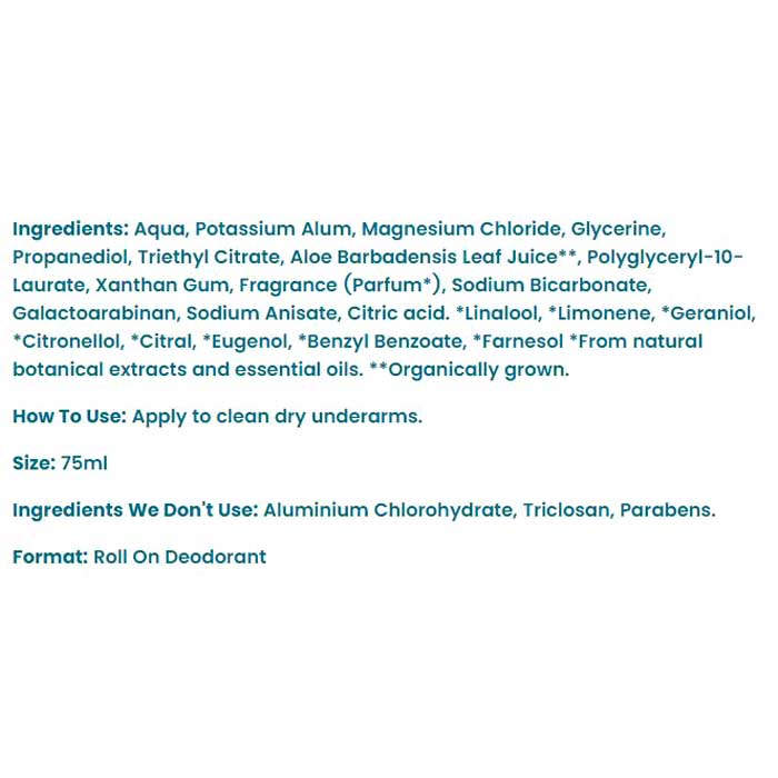 Aqua, Potassium Alum, Magnesium Chloride, Glycerine, Propanediol, Triethyl Citrate, Aloe Barbadensis Leaf Juice**, Polyglyceryl-10-Laurate, Xanthan Gum, Fragrance (Parfum*), Sodium Bicarbonate, Galactoarabinan, Sodium Anisate, Citric acid. *Linalool, *Limonene, *Geraniol, *Citronellol, *Citral, *Eugenol, *Benzyl Benzoate, *Farnesol